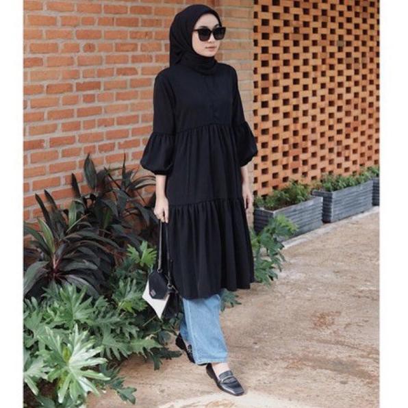 Baju Tunik Wanita Setelan Muslim Polos Hitam Jumbo Busui Bahan Rayon Premium